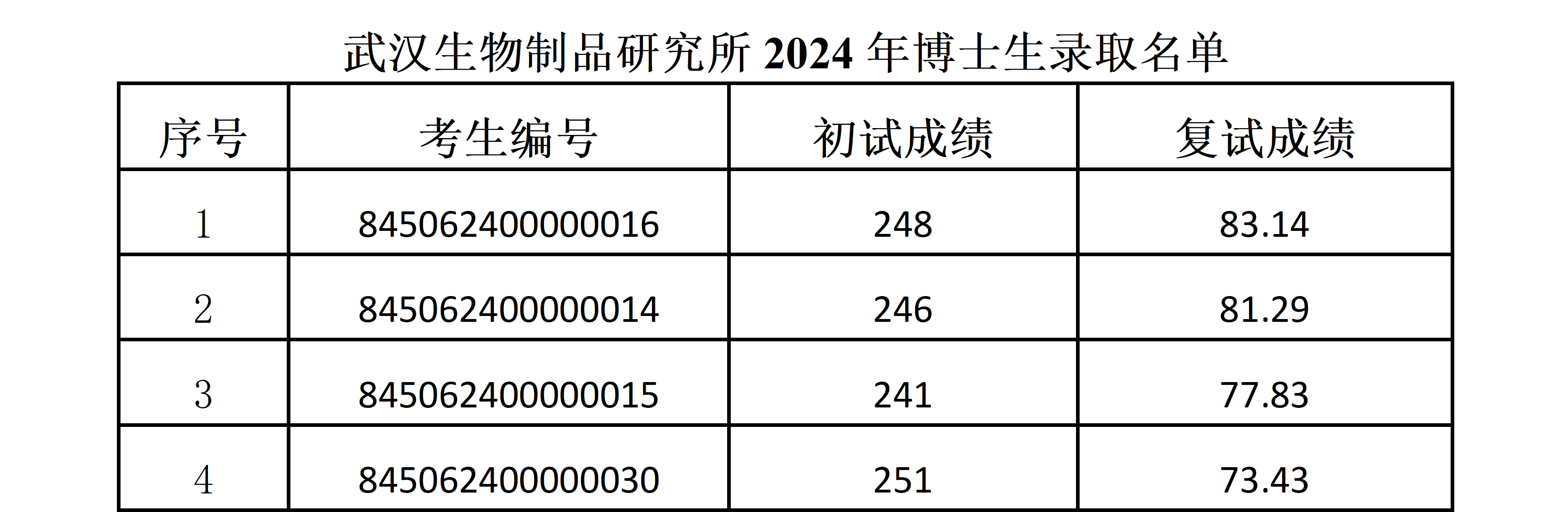 根據(jù)教育部《教育部關(guān)于做好2024年招收博士學(xué)位研究生工作的通知》文件精神,武漢所2024年博士研究生招生錄取名單在官網(wǎng)公示(為保護(hù)考生隱私使用考生號),公示時間:2024年5月06日-2024年5月19日。公示期間,考生若有疑問,可向我所有關(guān)部門反映。武漢生物制品研究所研招辦及紀(jì)委聯(lián)系方式: