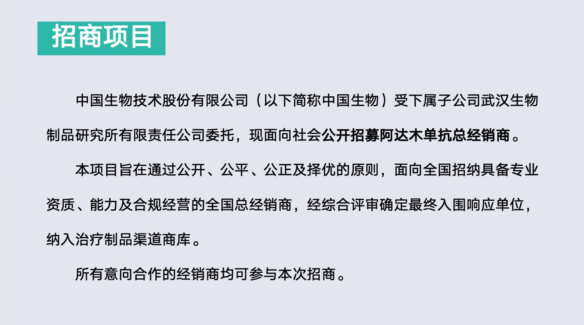【招商公告】中國(guó)生物技術(shù)股份有限公司2025至2028年阿達(dá)木單抗總經(jīng)銷商招商公告