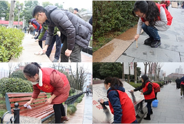 下午,活動(dòng)參與人員統(tǒng)一志愿者服裝著裝,集體前往武昌首義廣場(chǎng)。根據(jù)安排,志愿者們分成若干小組,拿出提前準(zhǔn)備好的清潔工具迅速投入到廣場(chǎng)的清潔中。桌椅清潔、地面打掃、垃圾分類、擺正路標(biāo),大家分工合作,干勁十足,不放過任何死角,對(duì)廣場(chǎng)周邊公共設(shè)施進(jìn)行了全面清潔,給游客及周邊居民提供一個(gè)良好的廣場(chǎng)環(huán)境。